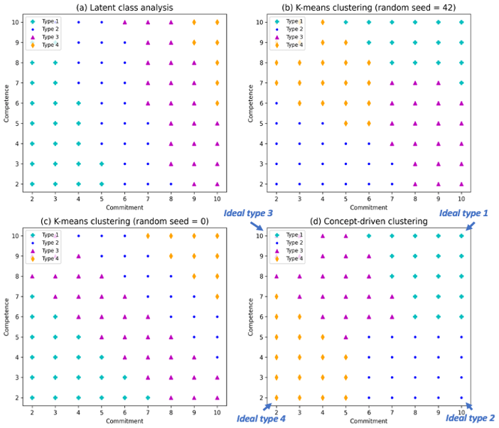 In an article published in The British Journal of Politics and International Relations, I applied this concept-driven clustering method to analyze data from thirteen nondemocracies. Specifically, I leveraged domain knowledge about trust in commitment and trust in competence to develop a fourfold typology of political trust. The ideal types of each trust type were then used as initial centroids for k-means clustering. By guiding the clustering process with these ideal types, this method ensures that survey respondents are categorized into the four conceptually derived trust types, setting it apart from data-driven methods (see supplementary materials for an illustration).